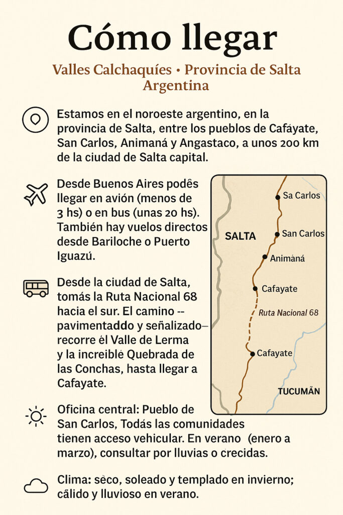 Desde la ciudad de Salta, tomas la Ruta Nacional 68 hacia el sur. El camino —pavimentado y señalizado— recorre el Valle de Lerma y la increíble Quebrada de las Conchas, hasta llegar a Cafayate.