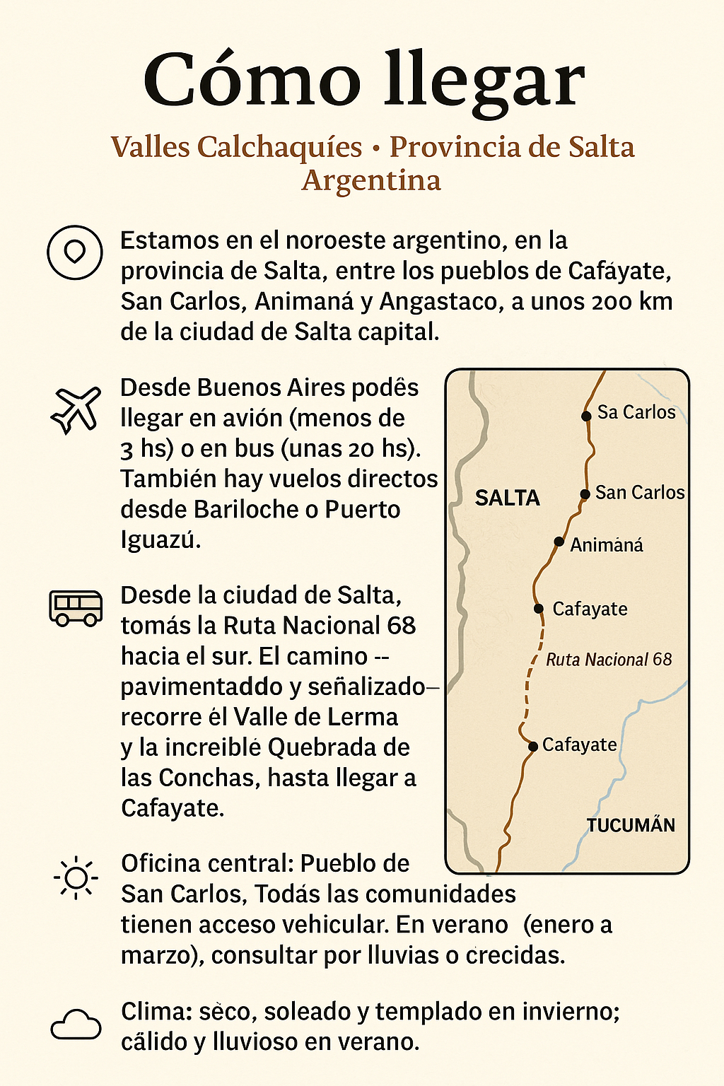 El mapa de la Red cubre más de 50 kilómetros sobre la Ruta 40, entre los municipios de Angastaco, San Carlos, Animaná y Cafayate. Cada comunidad es pequeña, pero firme: entre 20 y 40 familias que crían ganado, cultivan en pequeñas parcelas, organizan ferias, defienden la escuela y el puesto de salud, y —ahora también— reciben a quienes llegan con respeto y ganas de escuchar.